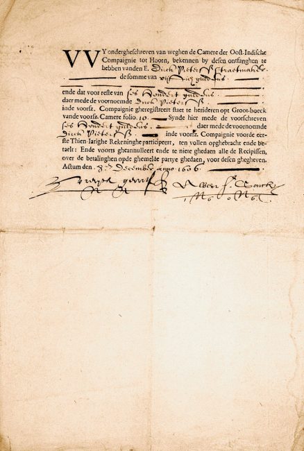 De onderneming zag er in de ogen van tijdgenoten ogenschijnlijk veelbelovend uit. In augustus 1602 werd in de zes VOC-kamers Amsterdam, Zeeland, Delft, Rotterdam, Hoorn en Enkhuizen, die de voortzetting waren van de vroegere voorcompagnieën , bij elkaar voor bijna 6,5 miljoen gulden ingetekend. Amsterdam nam daarbij ruim de helft voor haar rekening. De bedragen werden tussen 1602 en 1606 in vier termijnen opgevraagd. Ten bewijze van de kapitaalinbreng heeft de VOC in 1606 ontvangstbewijzen afgegeven aan alle aandeelhouders. Hoewel het hier strikt genomen nog niet om aandeelbewijzen ging, staan deze stukken in brede kring te boek als de oudste aandelen ter wereld. Stichting Capital Amsterdam (die het erfgoed van de Amsterdamse beurs beheert) is de trotse bezitter van één van de weinige bewaard gebleven exemplaren van dit document. De inleg verschilde per aandeelhouder. In Amsterdam was het hoogste bedrag van inschrijving 85.000 gulden, terwijl de kleinste inschrijving goed was voor 60 gulden. Opvallend is verder dat onder de VOC-aandeelhouders van het eerste uur alle rangen en standen vertegenwoordigd zijn. Naast regenten en edellieden komen we kunstenaars en dienstbodes tegen. Zelfs ‘ koeckebackers’ waren van de partij. In getal maar ook wat betreft hoogte van het ingelegde kapitaal worden alle beroepsgroepen echter verre overtroffen door de groep van handelaren en kleine en grote kooplieden. Zonder hen zou de ‘beursgang’ van de VOC zeker niet zo succesvol zijn geweest.