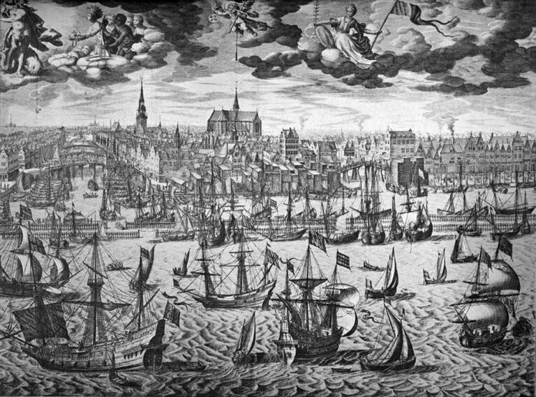 Gezicht op Amsterdam, gezien vanaf het IJ. Links in het midden de Nieuwe Brug met het Paalhuisje, waar in het begin van de 17e eeuw op straat de eerste VOC-stukken werden verhandeld.