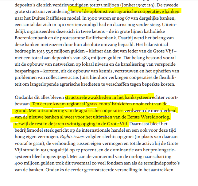 In de studie van de WRR kun je lezen dat er tussen 1900-1930 veel kleine ‘grass-roots’ initiatieven waren die hetzij opgingen in boerenleenbank of raiffeissenbank of stopten te bestaan. Zo’n proces waarin de sterken/professionele partijen overblijven noem je een shake-out. Door een shake-out in de markt wordt het kaf van het koren gescheiden. In de loop der tijd blijkt vanzelf welke partijen het beter doen dan anderen. Op deze manier waren er ook allerlei andere banken actief in de jaren 1900-1930. Uiteindelijk bleef er een kleiner aantal over. Maar er was ook overmoed in de markt. Er was een partij die zich verslikte in de overnames en dat was de Rotterdamsche bank. De man aan het roer geloofde iets teveel in zichzelf en dat ging mis. De bank moest gered. Zie prachtig boek Lodewijk Petram.